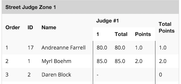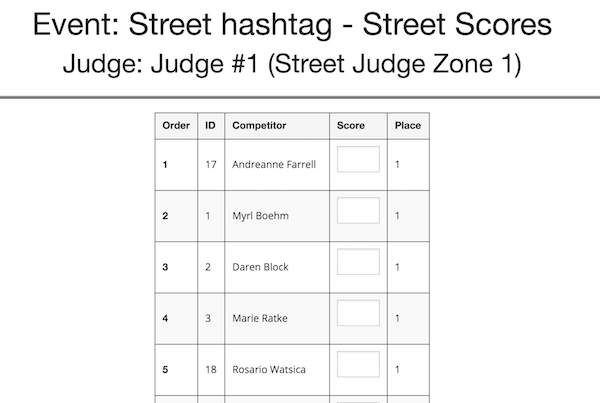 The Event director can configure a number of judge users for each of 3 different "zones". Each judge will be able to enter results